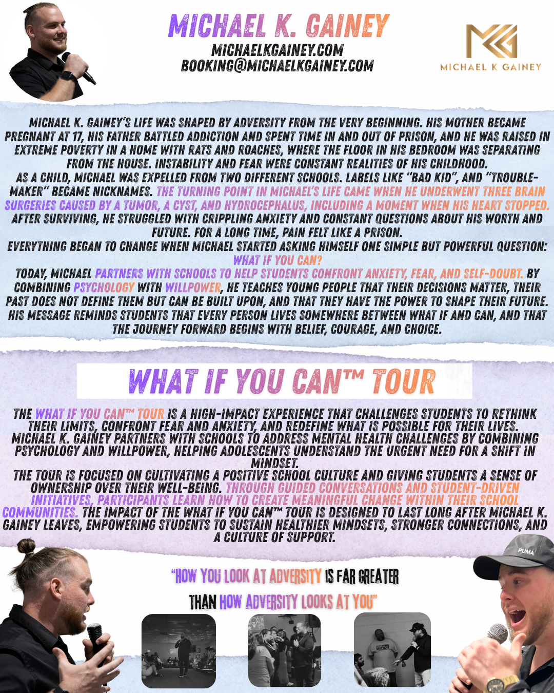 Today, Michael speaks because he knows what it feels like to be drowning in fear while everyone else assumes you are fine. Through the WHAT IF YOU CAN™ TOUR, he brings a new perspective to student mental health by revealing the science behind fear-based thinking and teaching students how to shift their mindset and transform fear into fuel for growth. His message leaves students more confident in their struggles, more knowledgeable about mental health, and more determined to rise above their circumstances and become the best versions of themselves.